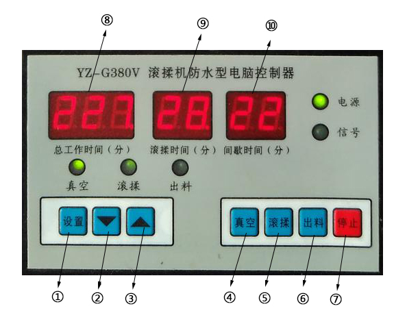 ⑦號(hào):停止鍵,停止真空滾揉機(jī)工作。
